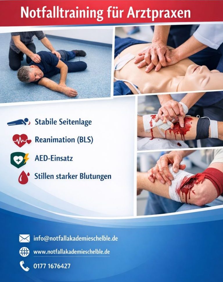 Die Notfallakademie Schelble bietet praxisnahe Notfalltrainings speziell für Arztpraxen an. Ziel ist es, Handlungssicherheit zu vermitteln und im Ernstfall schnell und richtig zu reagieren.