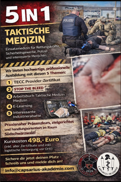 Die Notfallakademie Schelble bietet in Zusammenarbeit mit der Capsarius Akademie und Carsten Dombrowski einen TECC-Kurs (Tactical Emergency Casualty Care) an, exklusiv für Polizei, BOS Kräfte, Sicherheitsbehörden und Rettungsdienste. Diese Veranstaltung ist einmalig im Süddeutschen Raum mit Grenznähe zur Schweiz. Sie wird ein einmaliges Ambiente haben, da der Ausbildungsort ein Aussiedlerhof "die Farm" ist.
